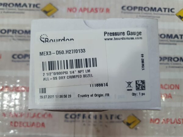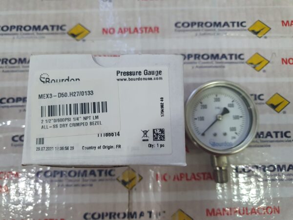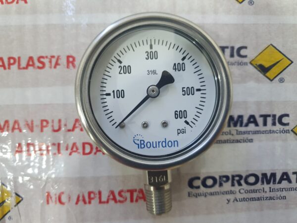 INDUSTRIAL PRESSURE GAUGE, 0 TO 600 PSI, 2 1/2 INCH DIAL, LIQUID-FILLED, 1/4 INCH NPT MALE